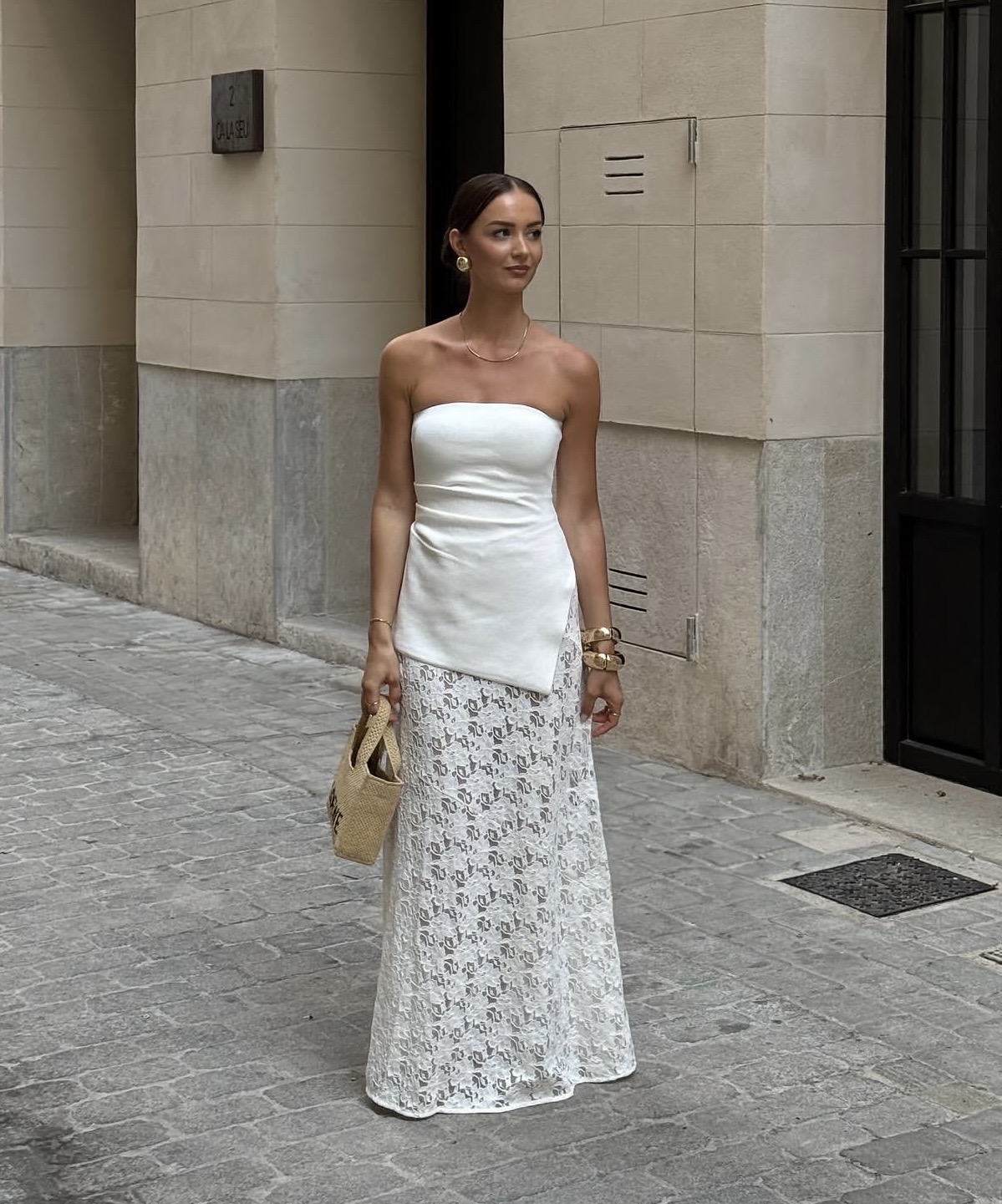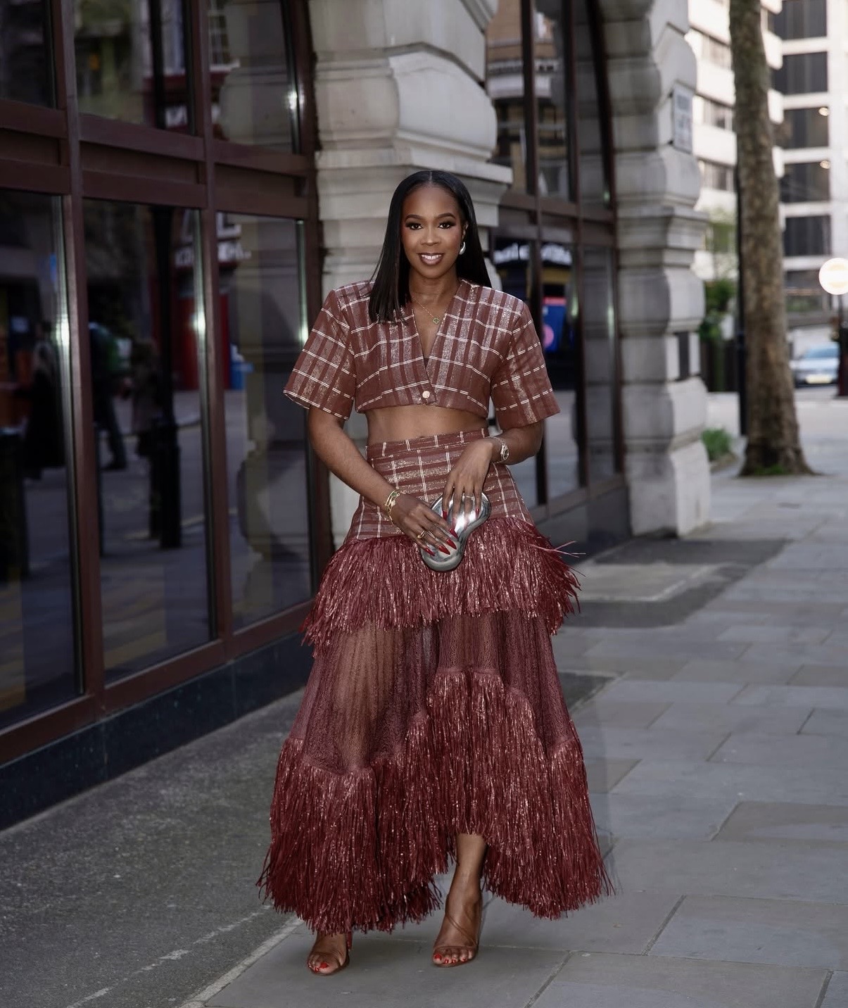 Pairing a structured corset top with a voluminous tiered maxi skirt introduces a dynamic tension between strength and softness. On one hand, the corset defines the upper body; on the other, the skirt softens the look through movement and volume. This interplay creates a more expressive, fashion-forward result.