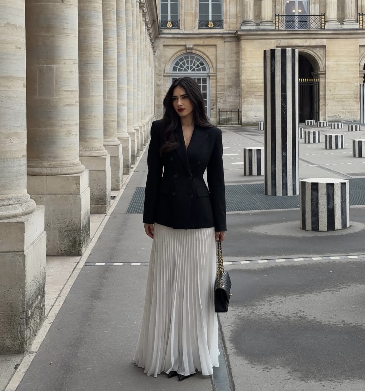 A fitted blazer styled with a high-waisted, pleated A-line maxi skirt brings contrast back into focus. The sharpness of the blazer offsets the skirt’s fluidity, creating a look that transitions seamlessly across settings. Ultimately, this pairing underscores just how adaptable the silhouette can be when balance is thoughtfully considered.