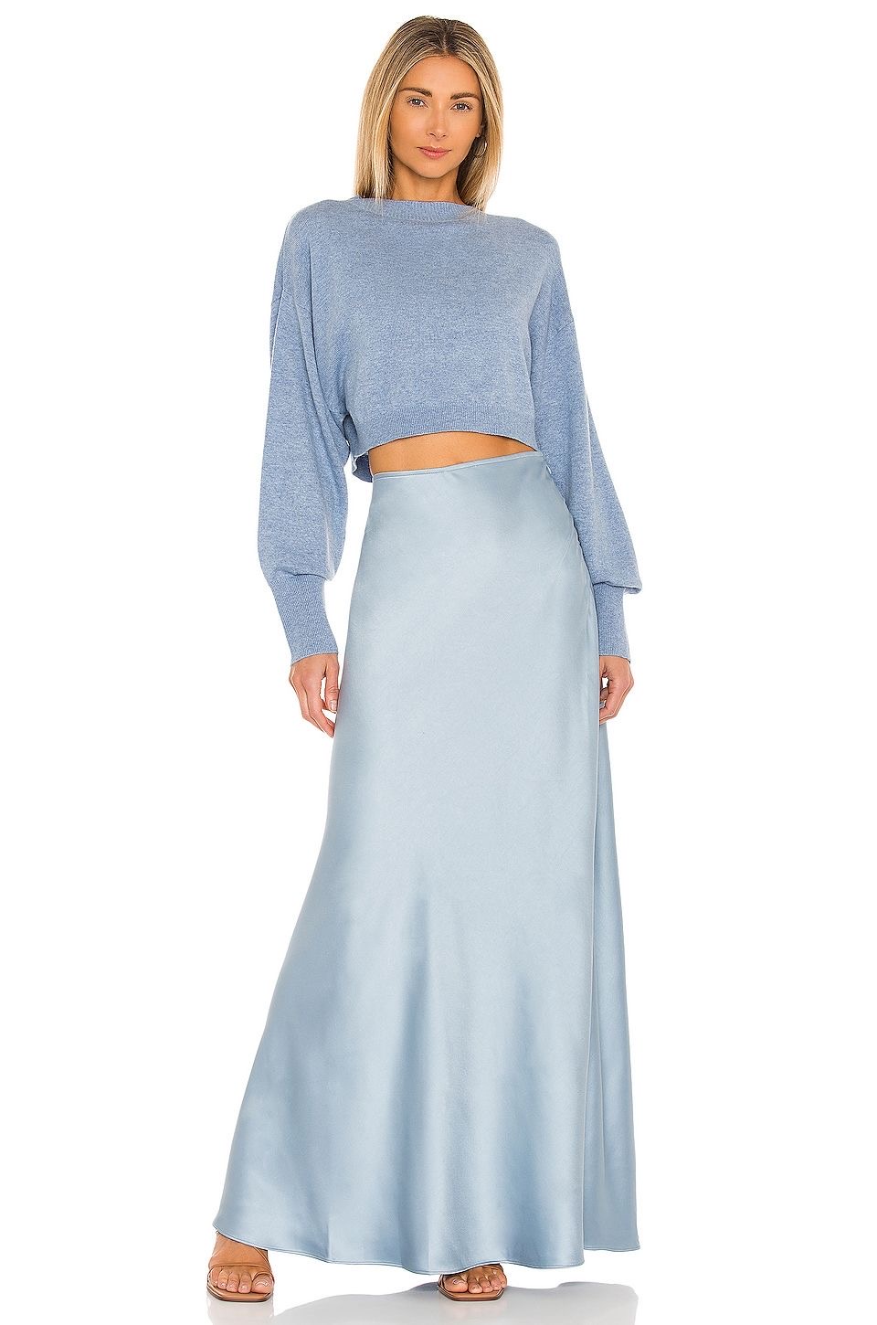 A cropped cashmere cardigan paired with a bias-cut satin maxi A-line skirt offers a softer interpretation of the trend. Here, the fluidity of the skirt follows the body, while the knitwear subtly defines the waist. The look is approachable for everyday wear, without sacrificing its elegance.