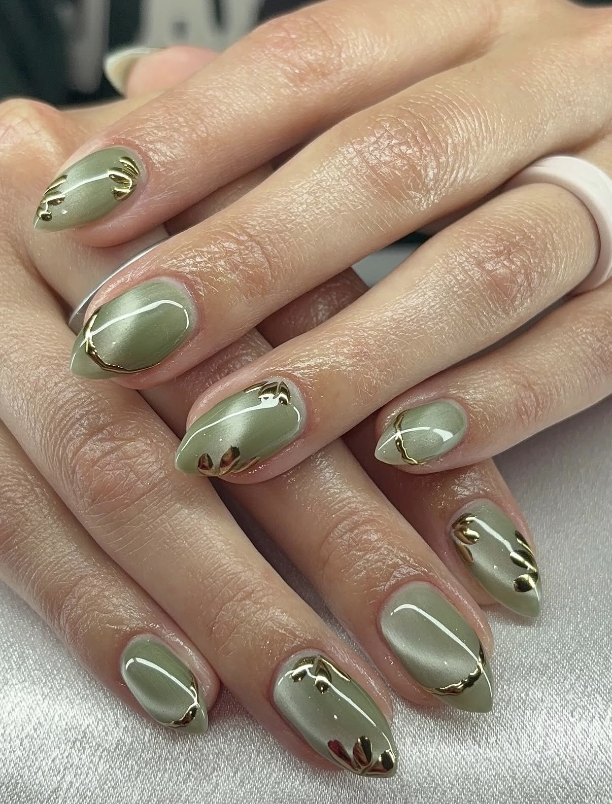 Sage green cat-eye polish introduces a magnetic, light-reflecting effect that feels instantly dynamic. When combined with 3D gold floral or linear accents, the design becomes detailed yet balanced. This style highlights how texture and light can completely transform a single shade.
