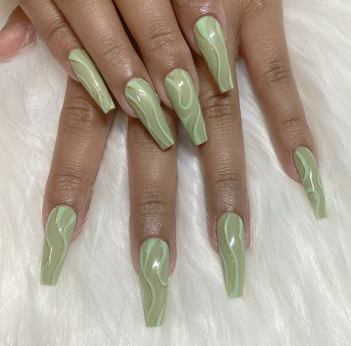 Finally, long coffin-shaped nails with sage green swirls and gold glitter accents bring a playful energy to the look. The flowing patterns create movement, while the glitter adds brightness, making this one of the more expressive interpretations of sage green nails for spring.