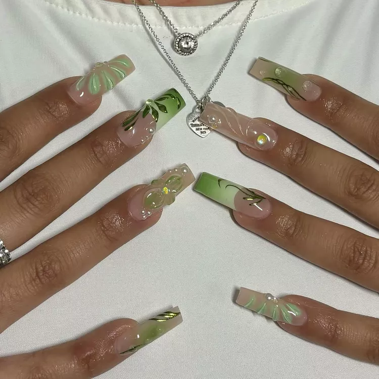 For a more expressive take, sage green paired with gold metallic details and 3D floral elements creates a dreamy finish. The raised accents add depth, while the gold brings definition. Altogether, this design aligns with the growing interest in imaginative yet wearable nail art.