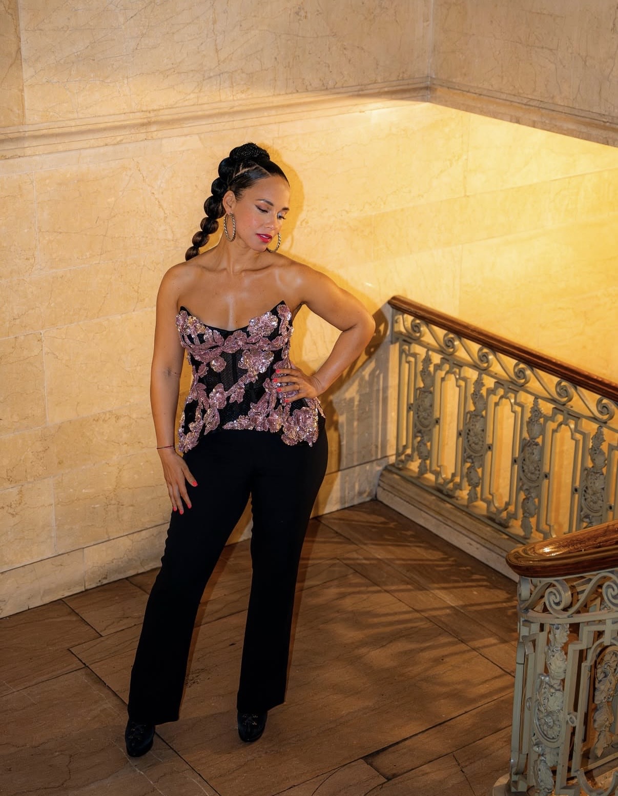 Alicia Keys brought a performance-ready edge to the week’s standout lineup with a strapless corset top adorned with lavender floral appliqués. Paired with tailored black pants, the look balanced bold detailing with clean lines.