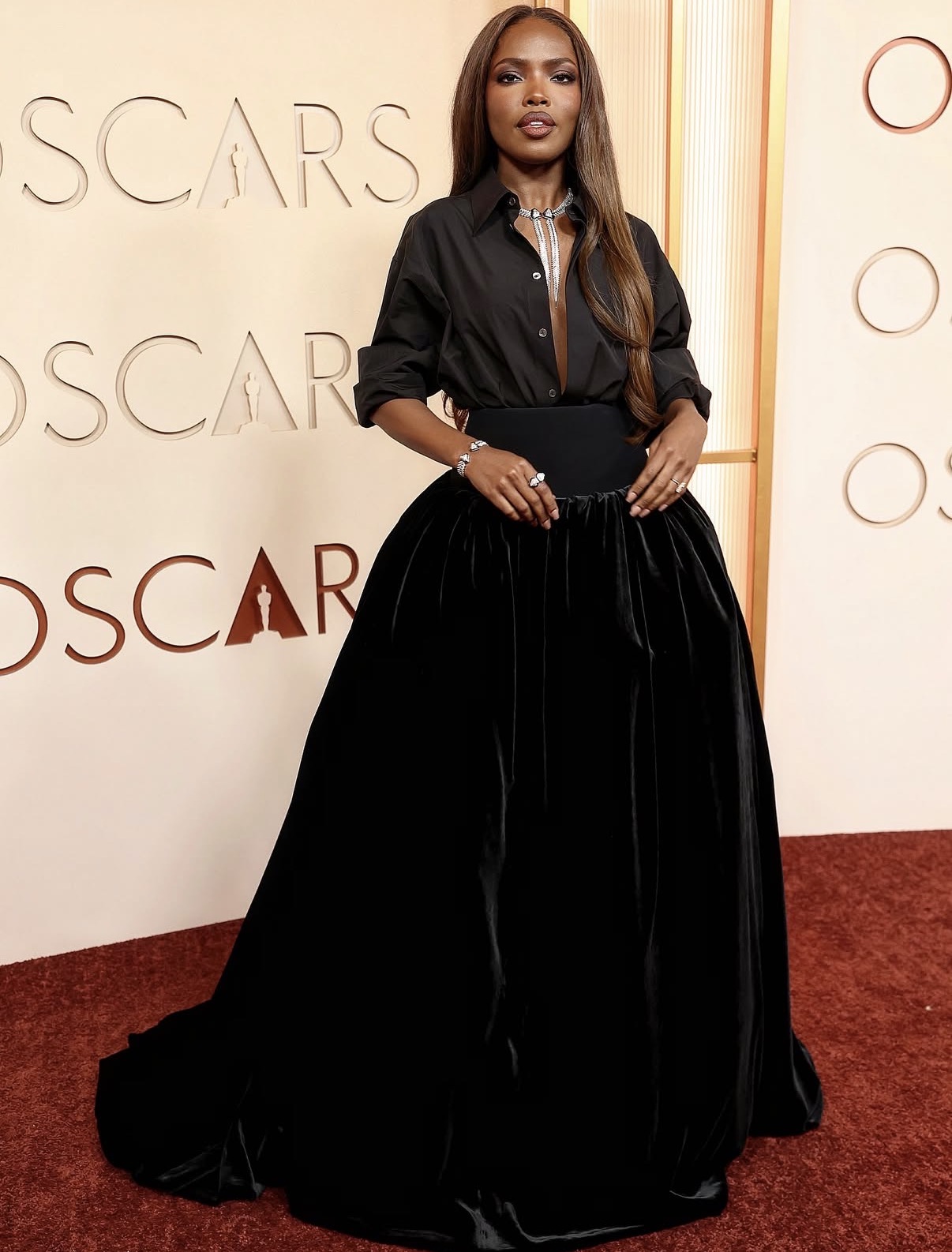At the 2026 Academy Awards, Ryan Destiny offered a refined contrast in monochrome black dressing. A tailored shirt met a voluminous velvet skirt, creating architectural balance. Statement jewelry added dimension without overwhelming the look.