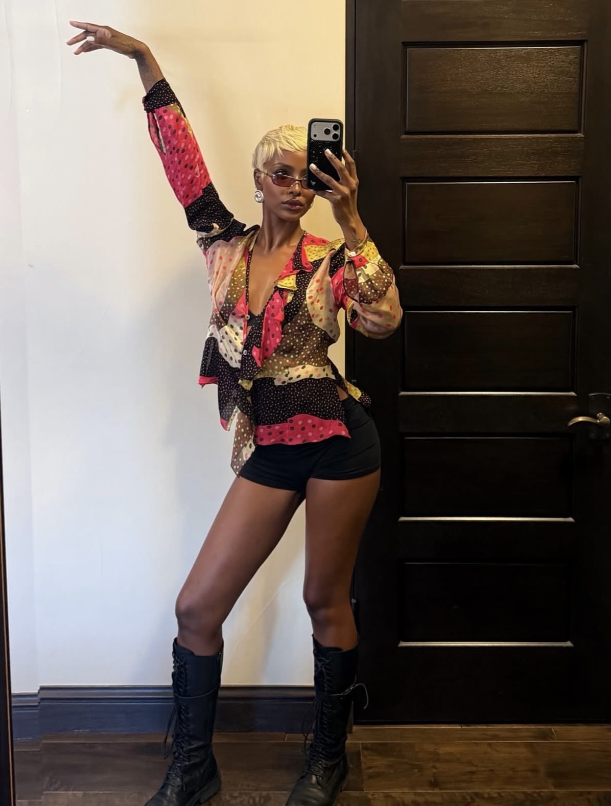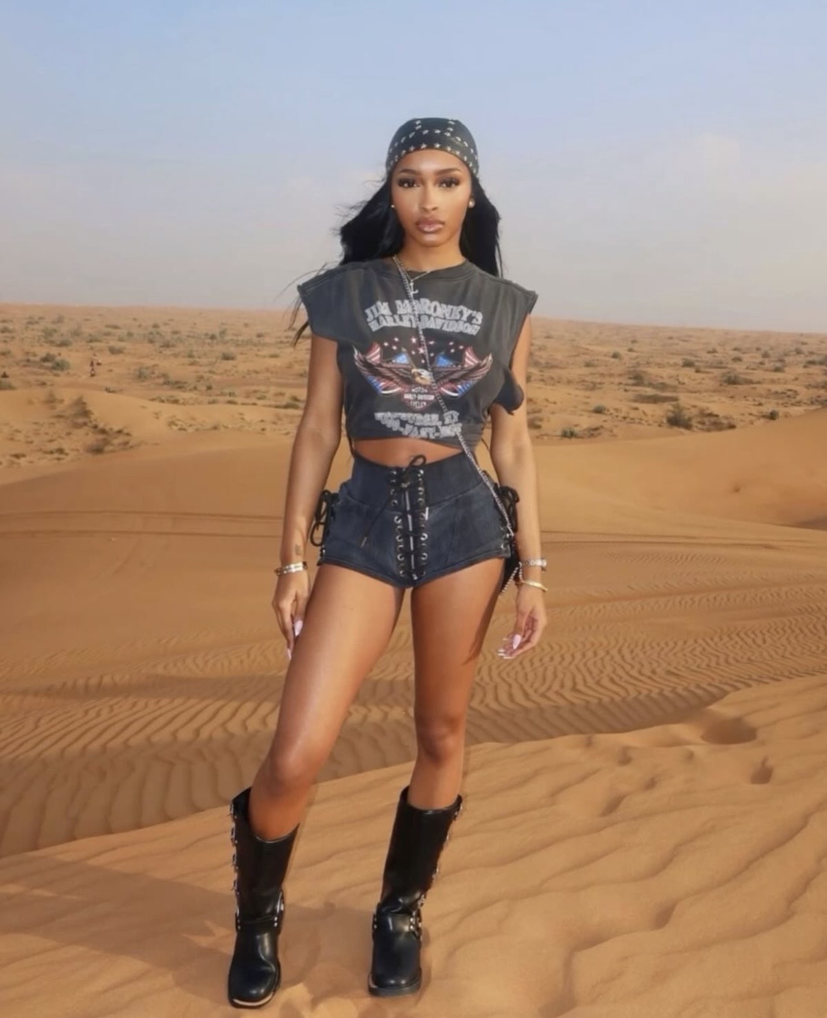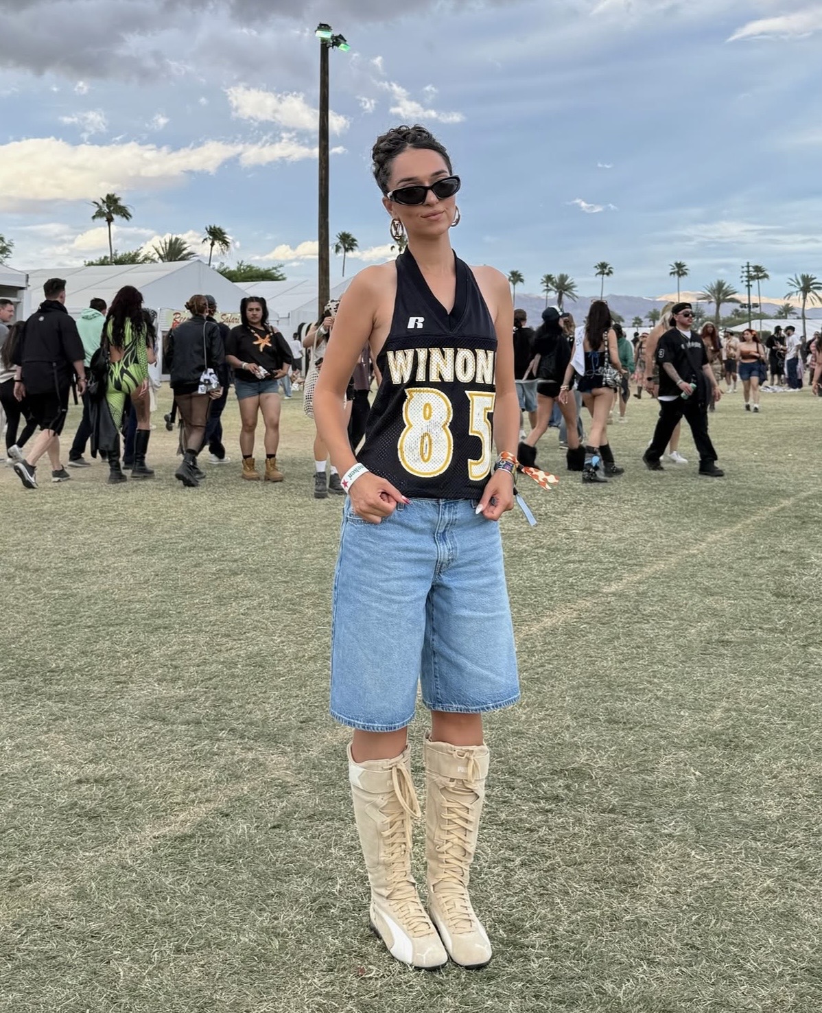 Streetwear continues to influence festival style with oversized proportions and graphic details. A graphic crop top styled with ultra-baggy jorts introduces a playful, rebellious edge that stands out against more bohemian looks. Platform-heavy boots anchor the outfit with attitude, projecting a skate-inspired, high-energy aesthetic built for crowded stages and late-night sets.