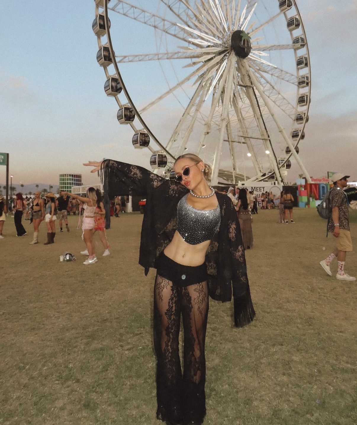 Layering remains essential for desert longevity. A sheer, loose top worn over a bralette and high-waisted briefs or leather shorts offers coverage while maintaining an ethereal aesthetic. This combination carries a soft, dreamlike glamour that transitions effortlessly from sunset to after-dark sets.
