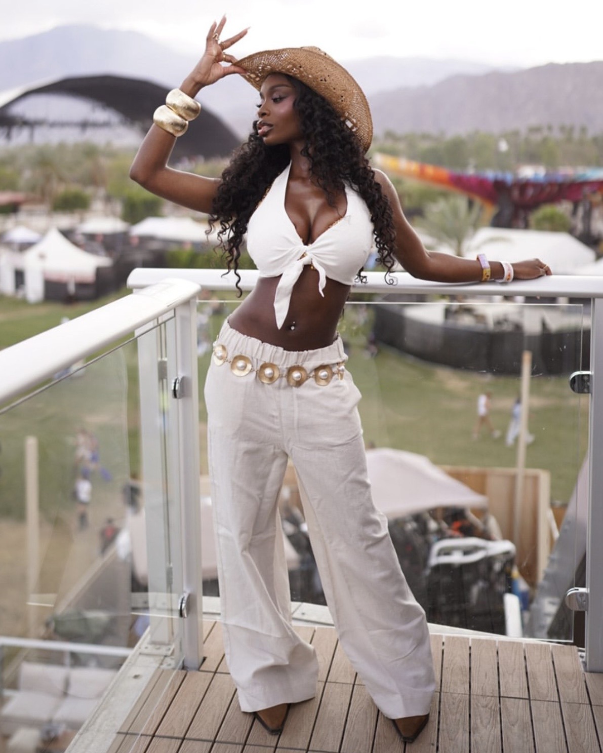 Relaxed tailoring is emerging as a major festival direction this year. A lightweight tie-front top paired with breezy wide-leg pants creates movement while allowing airflow during long afternoons under the desert sun. Finished with bold Western-inspired accessories, like statement belts or oversized buckles, the outfit carries an easygoing, desert-nomad energy that’s practical and polished.