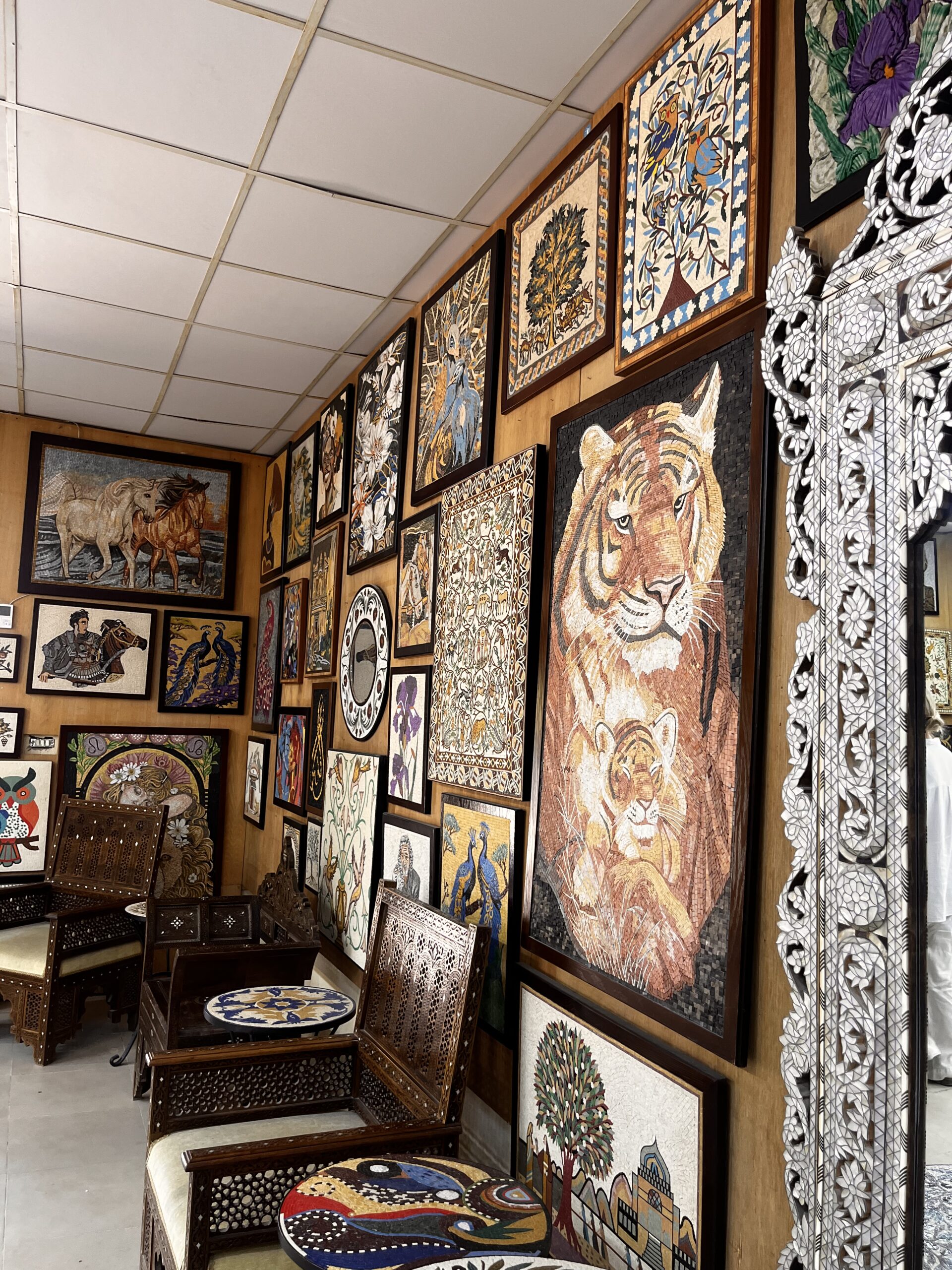 We visited a – do I call it a Mosaic store? – and I was blown away. Stunning designs, intricate and brilliant jewelry making. The mosaics are sometimes combined with pure gold or silver to make the perfect jewelry. It could be a pendant or earring. See photos!