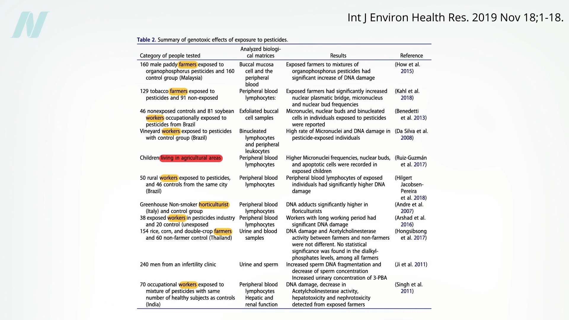 There is evidence linking non-occupational pesticide exposure to DNA damage—in this case, single- and double-stranded DNA fragmentation in the sperm of men with higher levels of pesticides flowing through their bodies—but that was in China, where the average pesticide concentrations are as much as four times higher than in some other parts of the world.