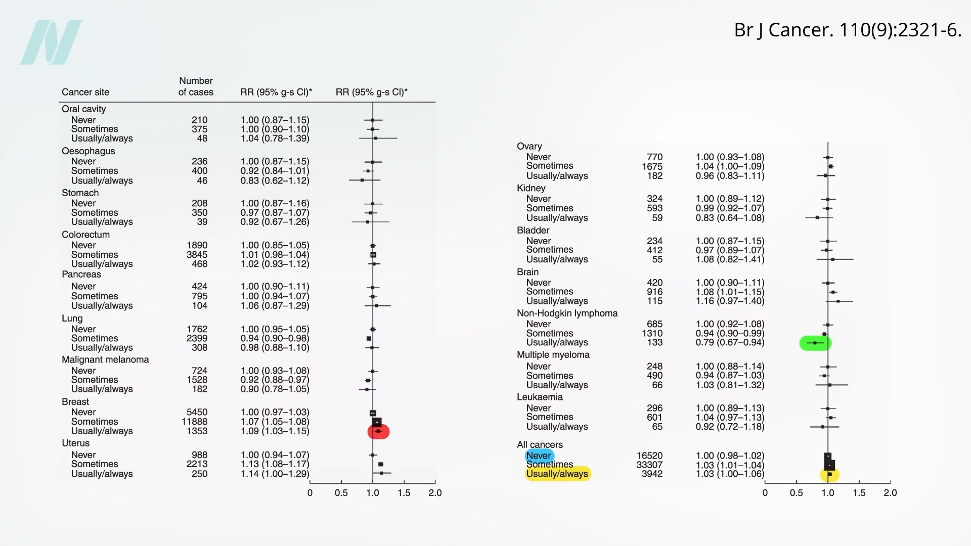 That was the most sophisticated study of its type to date, but there was an earlier study that was even bigger, and little evidence was found for a decrease in the incidence of all cancers except for perhaps one kind of blood cancer—non-Hodgkin lymphoma. You can see the data below and at 3:59 in my video.