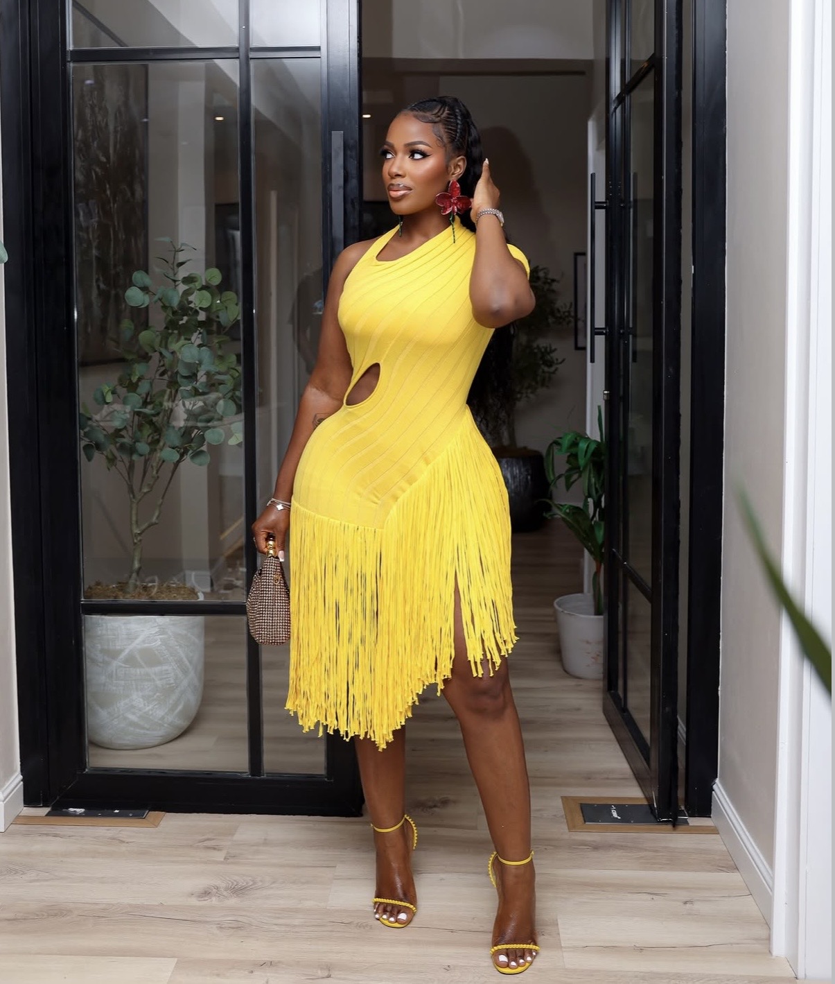 Hilda Baci injected vibrant energy into the style lineup with a bold yellow fringe mini dress designed for movement and visual impact. The asymmetrical silhouette featured cascading fringe that swayed with every step, while a subtle side cutout introduced a contemporary edge to the design. Matching yellow heels extended the monochromatic statement, while bold red earrings provided a striking contrast that amplified the outfit’s playful spirit.