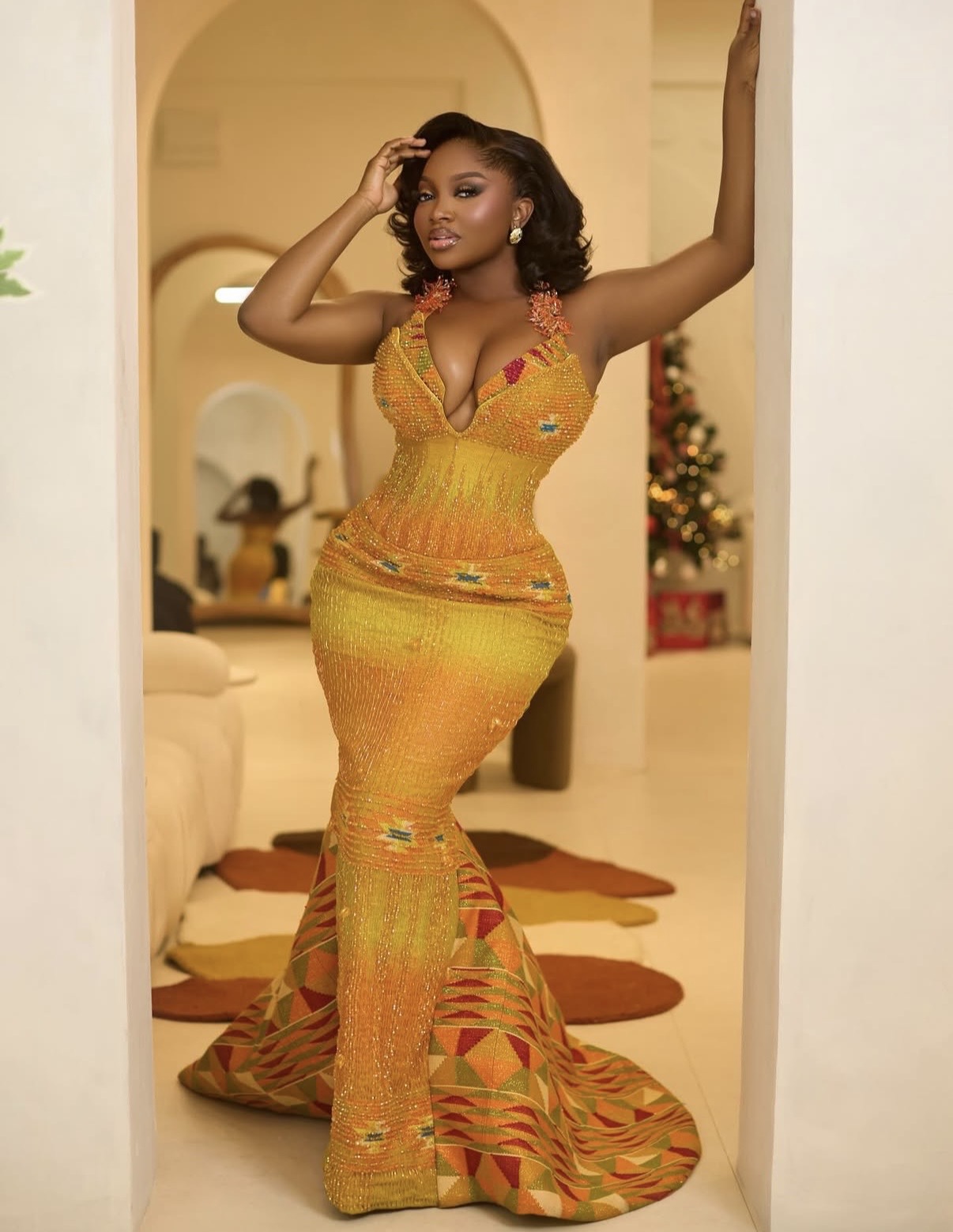 The corset-style bodice sculpted a defined waistline while shimmering beadwork created a luminous gradient across the upper portion of the dress. As the gown flared into a sweeping train, bold Kente blocks emerged near the hemline, turning the outfit into a striking blend of cultural storytelling and high-fashion spectacle.
