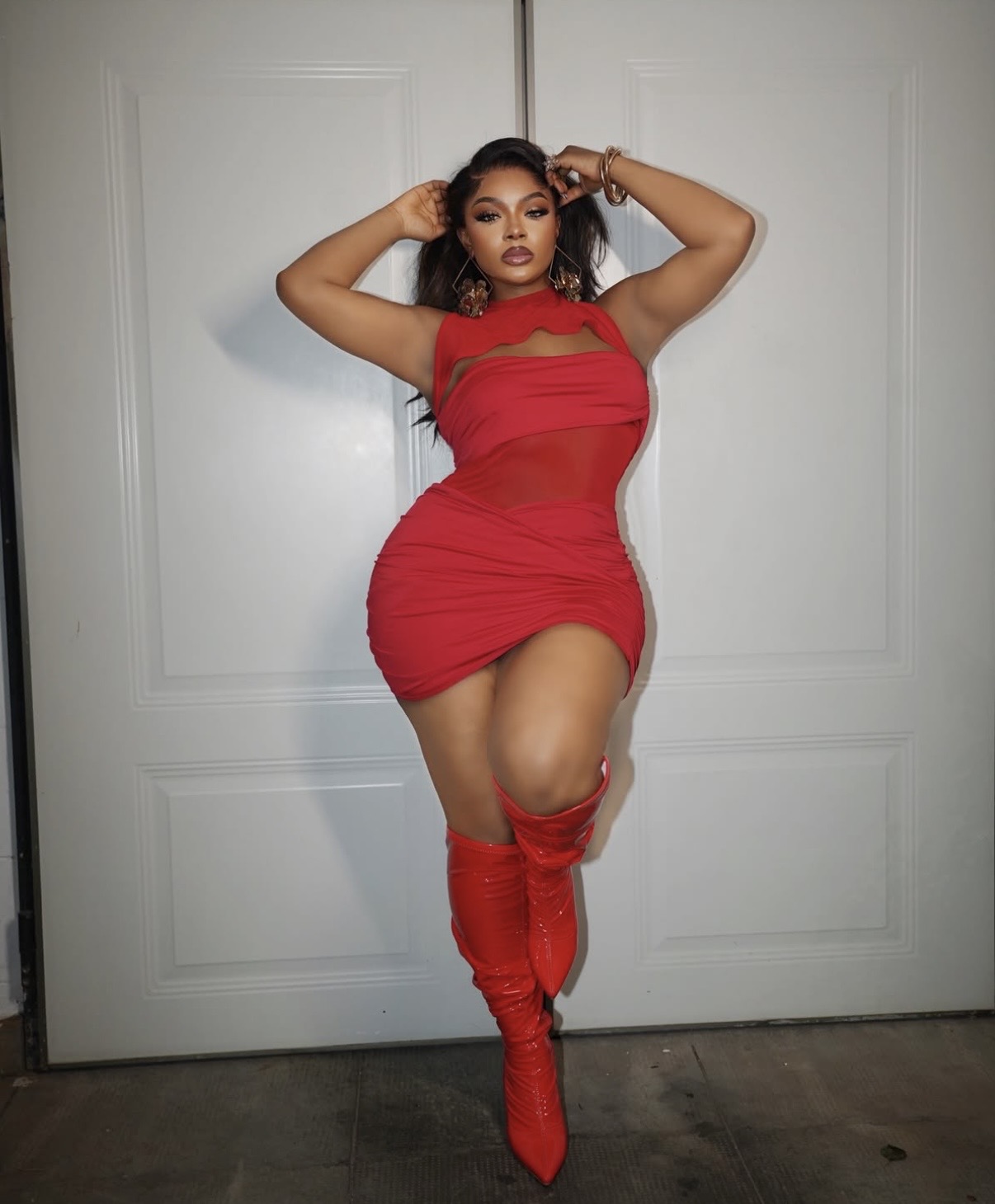 Her bodycon mini dress featured sculptural ruching and subtle cutout details along the neckline and midsection. Over-the-knee patent leather boots extended the vibrant red palette while amplifying the outfit’s impact. Gold jewelry introduced a hint of shine, completing the fearless look.