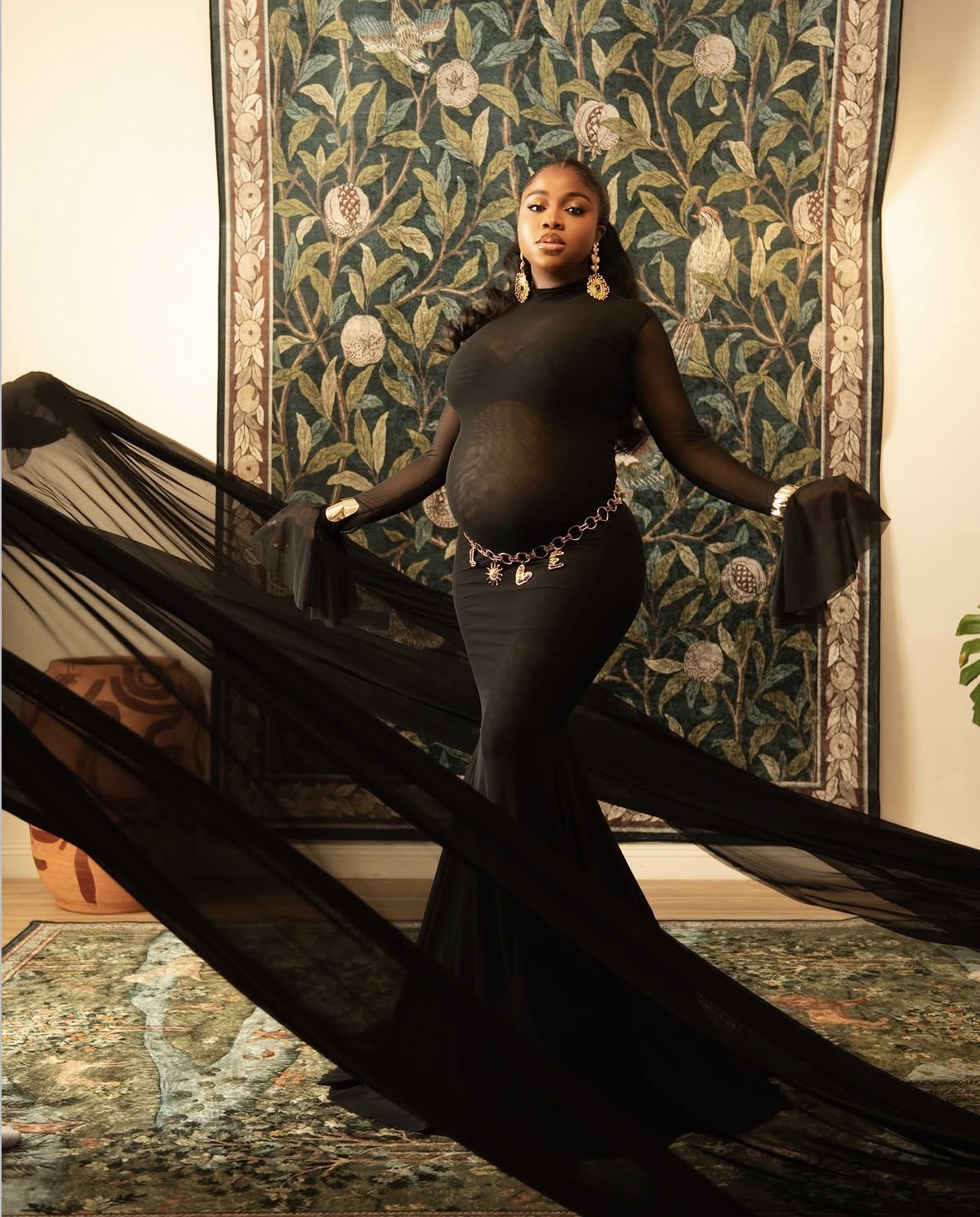 Veekee James Atere turned maternity fashion into a bold style statement with a dramatic black gown that celebrated both elegance and strength. The sheer mesh design featured a high neckline and long sleeves that framed the body with sculptural precision. Meanwhile, the fitted silhouette highlighted her baby bump before flaring into a mermaid-style hemline that introduced graceful movement. Gold hoop earrings, stacked bangles, and a delicate chain belt completed the look with striking confidence.