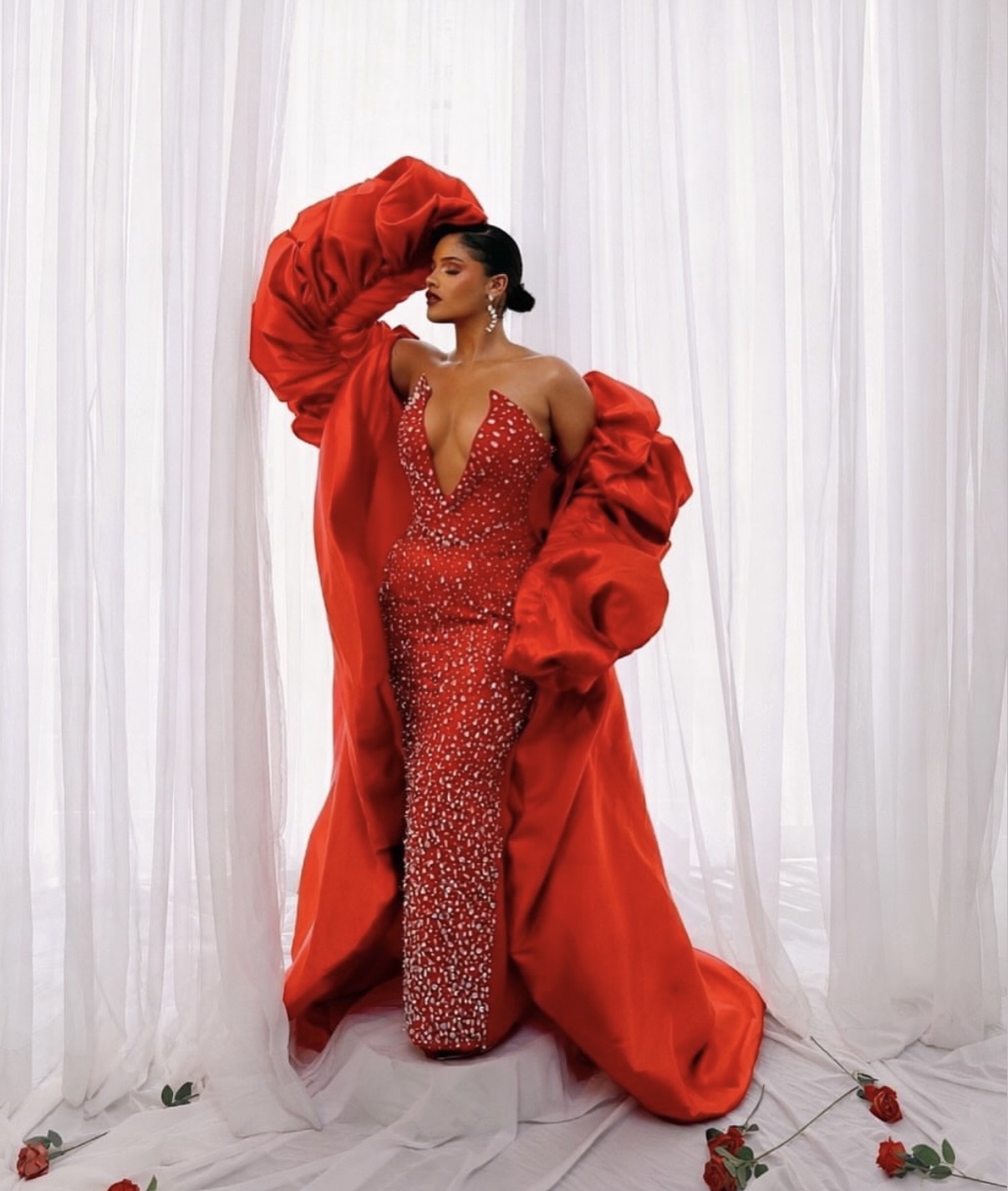 Dense hand-beading in shimmering red crystals and pearls created a high-shine, textured surface that emphasized craftsmanship. In addition, the oversized cape, complete with exaggerated 3D floral sleeves, introduced a theatrical dimension. As the cape swept into a trailing train, the look felt regal without veering into excess.