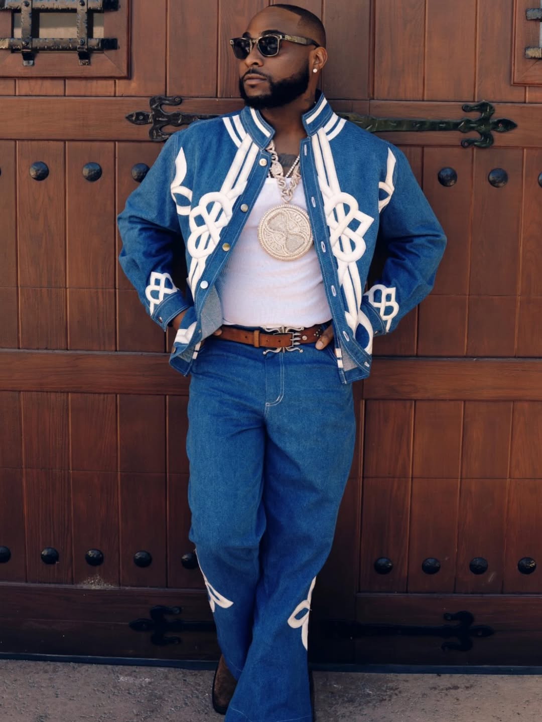 On the performance side, Davido brought bold, high-energy style to the Coachella stage with a look that merged classic denim with cultural flair. His coordinated blue set, anchored by a structured jacket and matching trousers, was punctuated by bold white appliqué patterns that introduced texture and movement. A fitted white tank provided balance, while a brown leather belt subtly broke the tonal uniformity. True to his aesthetic, Davido amplified the look with statement accessories: layered chains, a prominent pendant, dark sunglasses, and stud earrings. The overall effect was both performance-ready and globally resonant, blending Afrobeats confidence with festival-ready edge.