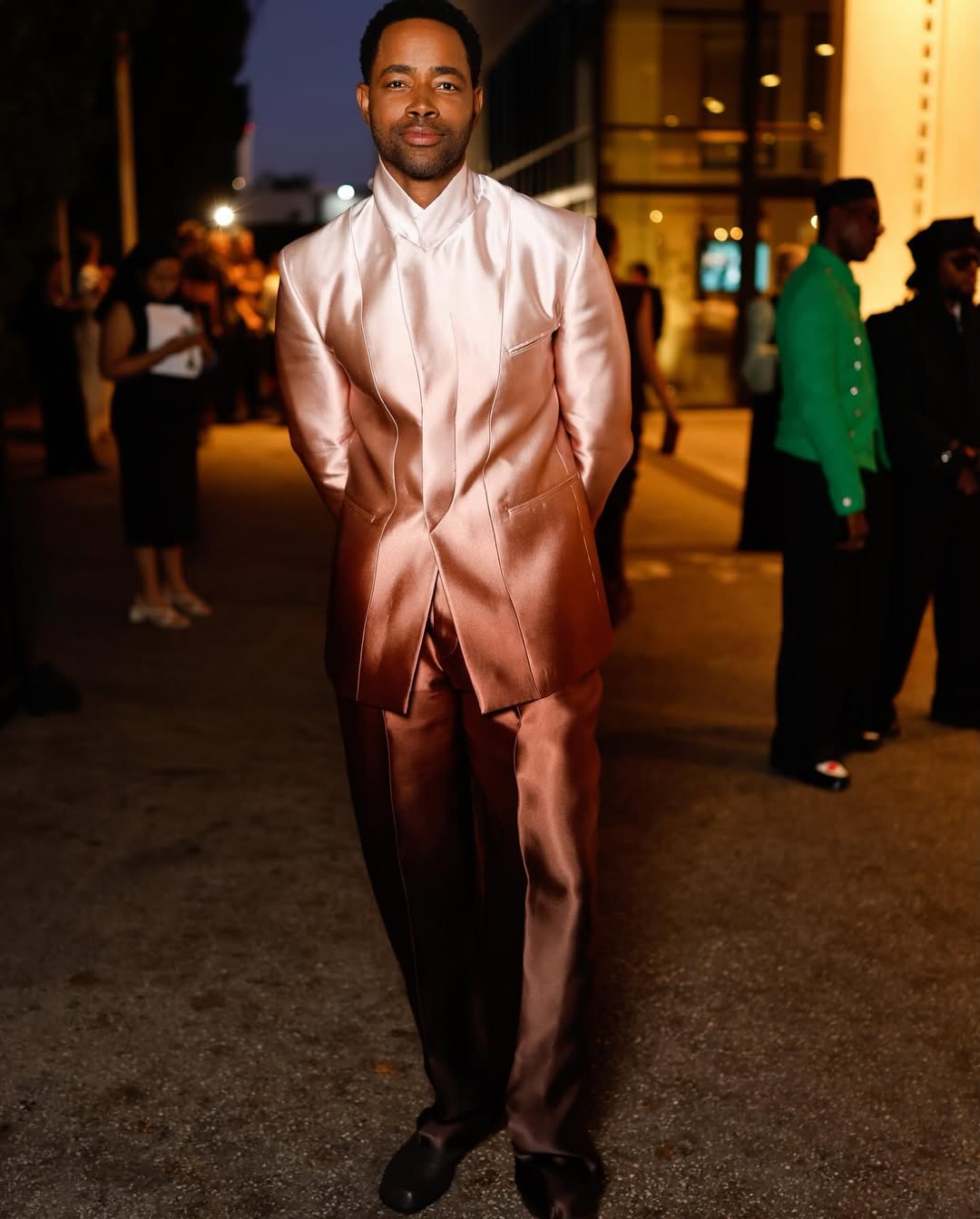 Jay Ellis delivered a compelling take on modern red-carpet dressing at the Fashion Trust U.S. Gala in a look by Ferrari that balanced futurism with restraint. His satin-finished ensemble, rendered in a champagne-bronze hue, centered on a sculpted mandarin-collar jacket with elongated lines and subtle paneling. The matching trousers extended the monochromatic narrative, allowing the fabric’s sheen to take focus. Notably, Ellis opted to forgo a shirt, letting the sharp neckline and precision tailoring carry the look. Grounded by understated black footwear, the result felt sleek, confident, and quietly subversive.