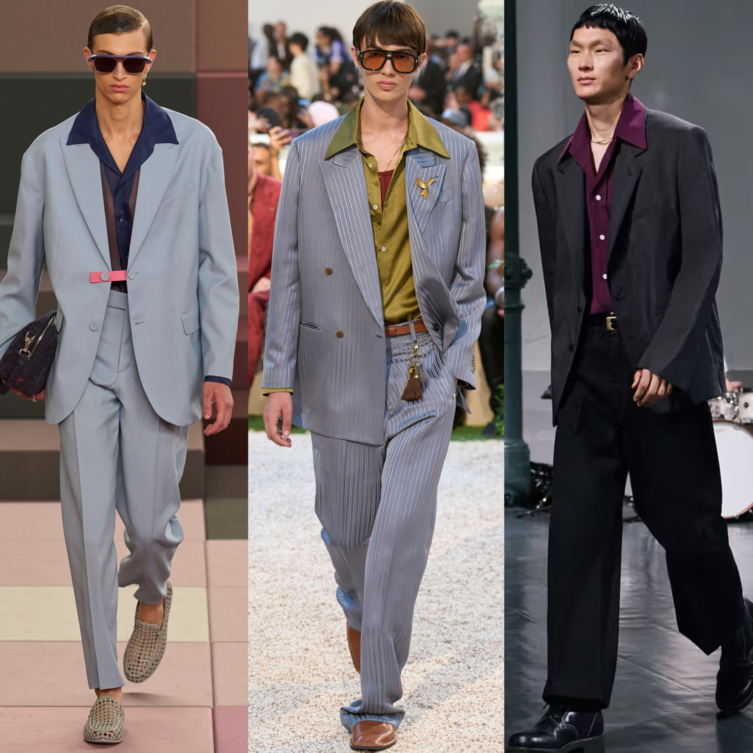 Finally, there’s a subtle but undeniable throwback energy. Brands like Fendi and Boss delivered open shirts, wide collars, and fluid tailoring that nod to vintage summer style, somewhere between retro Miami and modern luxury.